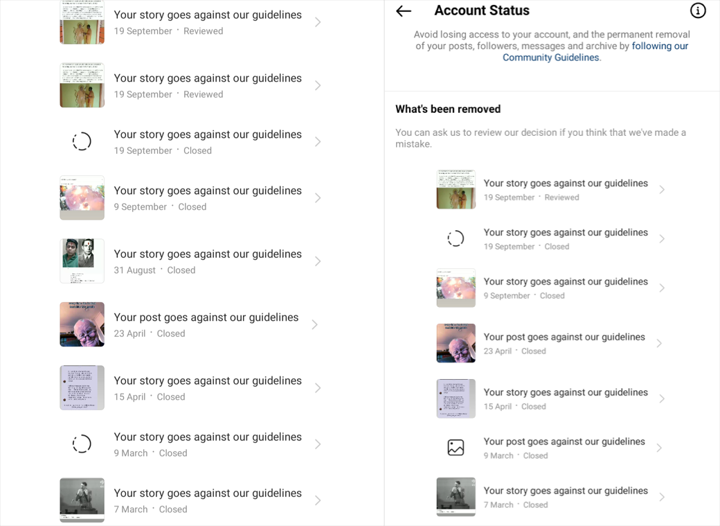 Left: The screenshot of takedown notifications sent to @cringearchivist, taken on September 23, 2022. Right: The screenshot of the same page taken on October 13, 2022, with the notification relating to the August 31 post missing.