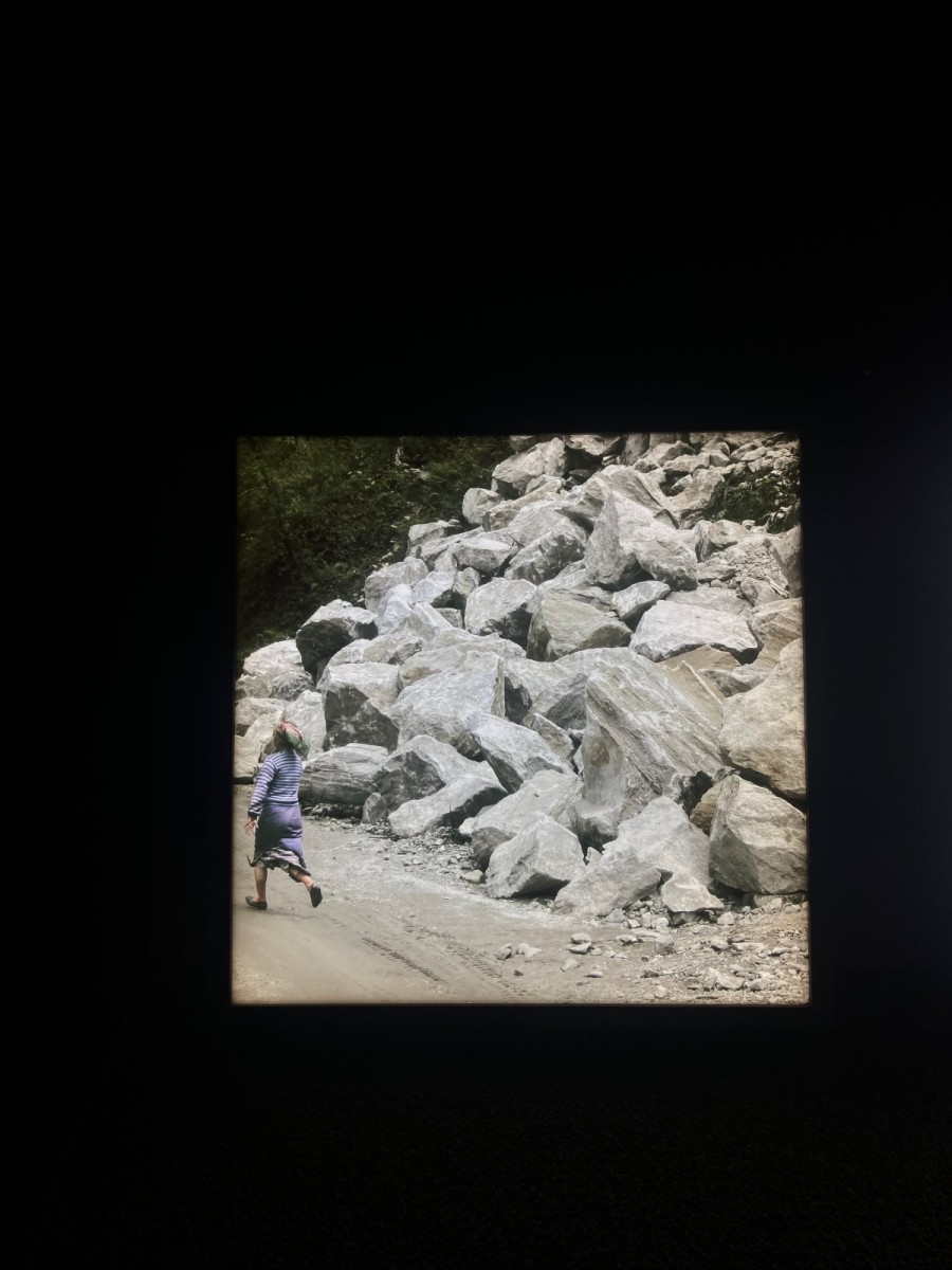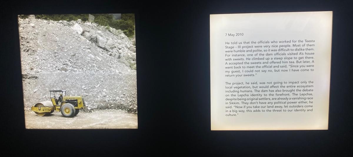 Another dam and its impacts – this time in north Sikkim’s high-altitude Changthang landscape – find place in the Biennale through the work of Ruchika Negi and Amit Mahanti. Photographs displayed via light boxes document the impacts of the Teesta III dam on the Teesta river and the resulting destructive environmental change on people, through snapshots of scarred mountains and “confused words” (as the write up on the work at the Biennale says).