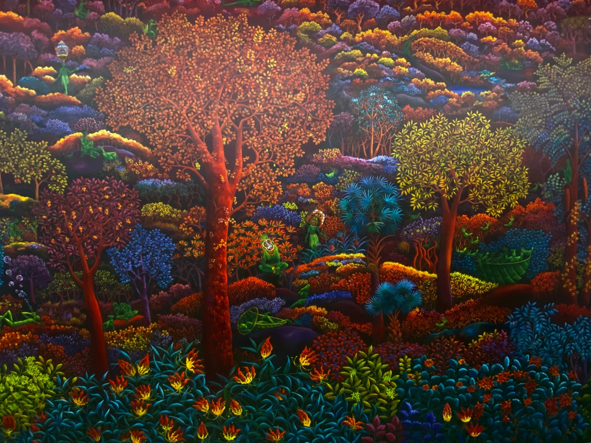 Kerala metaphysical artist G.S. Smitha’s vibrant and detailed illustrations depict wildlife and people in forests. Oft-ignored or lesser-known species dot the canvas, as do people and forest gods donning colorful masks.