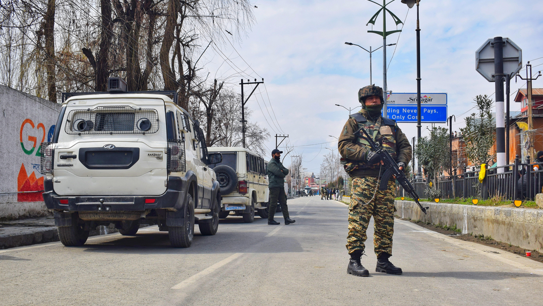 Security forces standing guard near the entrance to Bakshi Stadium in Srinagar where Modi addressed a rally on March 7, 2023. Photo: Ubaid Mukhtar